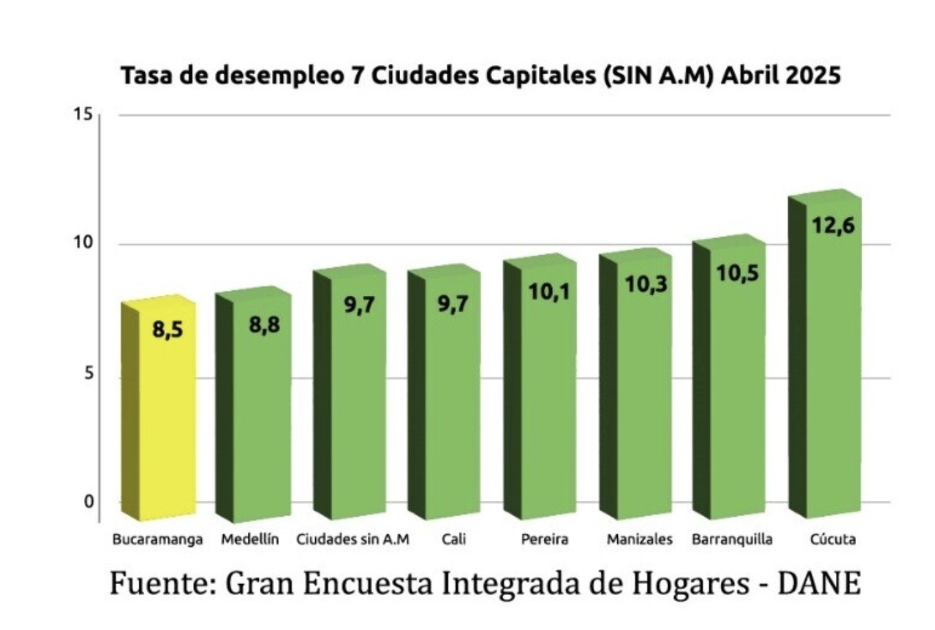 De igual forma, la cifra de desempleo en el Área Metropolitana de Bucaramanga se ubicó en 8,8%, posicionándose como la cuarta más baja del país entre las principales áreas evaluadas por el DANE, lo que refleja también un comportamiento favorable en la región.